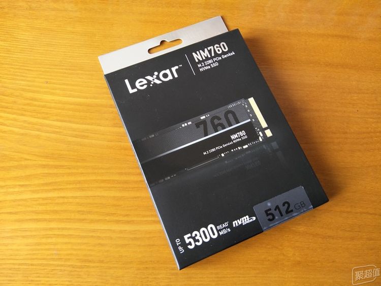 雷克沙固态硬盘的包装是一个可以悬挂的扁盒子,以黑色为主色调,盒子正面有硬盘的图片,上方是雷克沙的logo,右上是产品的型号,这款是NM760,左下是明显的读取速度信息,这款SSD的读取速度可以达到5300MB/s,右下角标明了硬盘的容量,512GB。